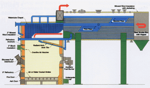 The upper furnace is an extended watertube furnace which offers water cooling of the primary combustion chamber which results in cooling the flame temperature prior to entering the multipass firetube boiler.