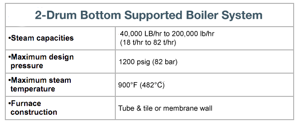 The 2-drum bottom-supported boiler is offered in a wide variety of fuel firing combinations including gas/oil burners, solid fuel suspension burners (for sander-dust), and continuous ash discharge stokers including traveling grate, air and water-cooled vibrating grates.