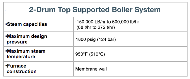 The 2-drum top-supported boiler is offered in a wide variety of fuel firing combinations including gas/oil burners, solid fuel suspension burners (for rice hulls and sanderdust), and continuous ash discharge stokers including traveling grate, air and water-cooled vibrating grates.